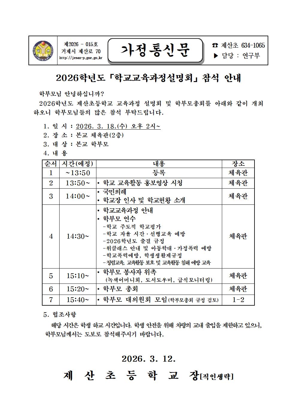2026. 학교교육과정설명회 및 학부모총회 개최 안내
