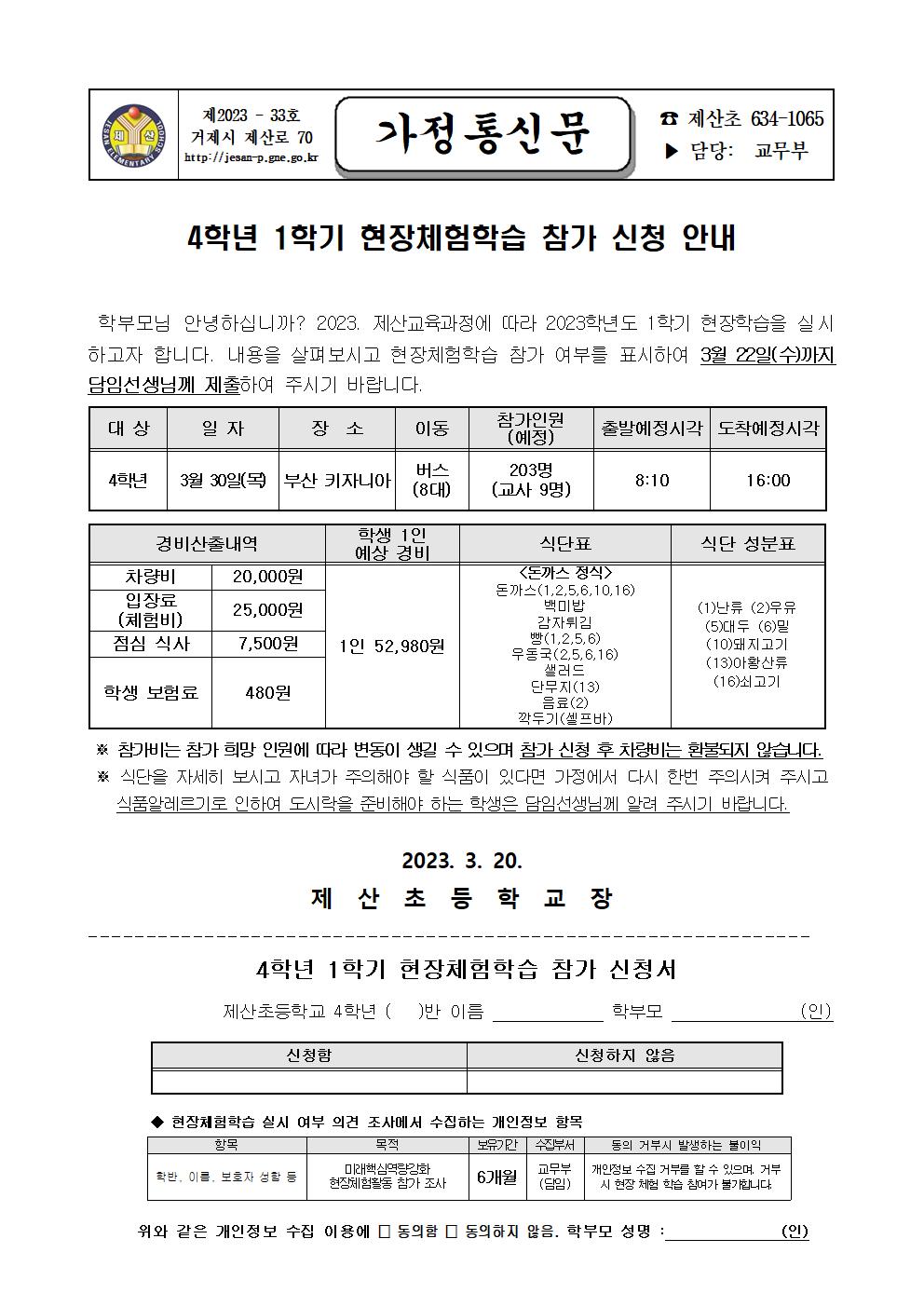 2023학년도 4학년 1학기 현장체험학습 참가 신청 안내