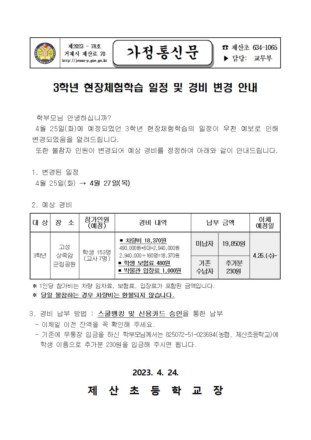 2023. 3학년 현장체험학습 일정 및 경비 변경 안내