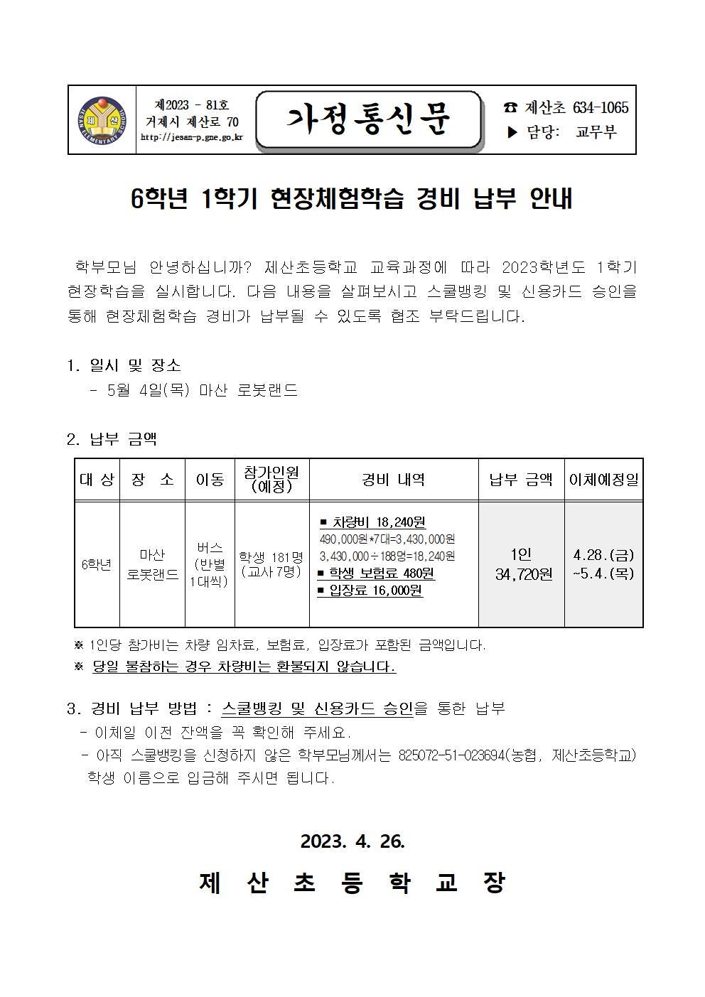 2023학년도 6학년 1학기 현장체험학습 경비 납부 안내