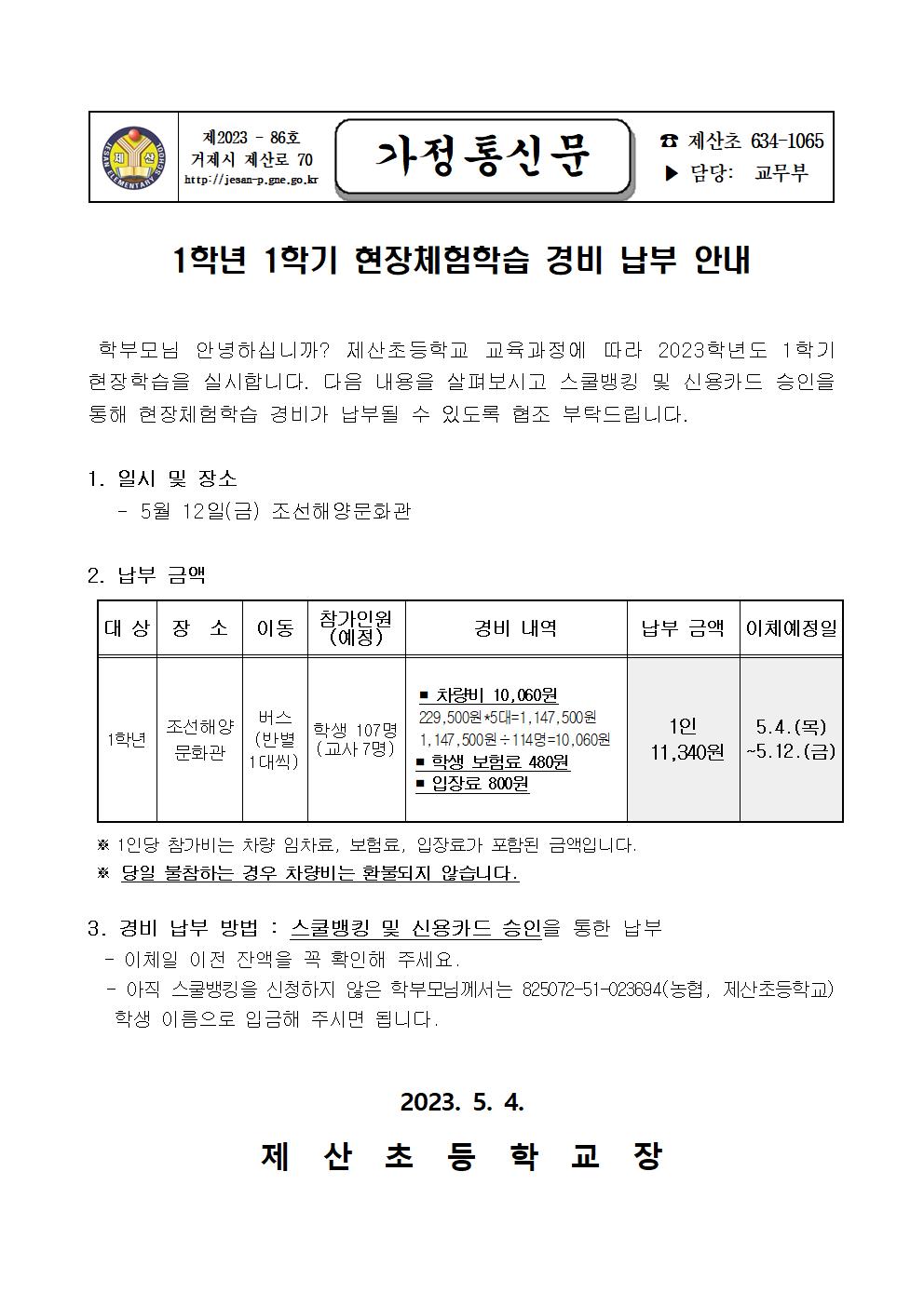 2023. 1학년 1학기 현장체험학습 경비 납부 안내.pdf