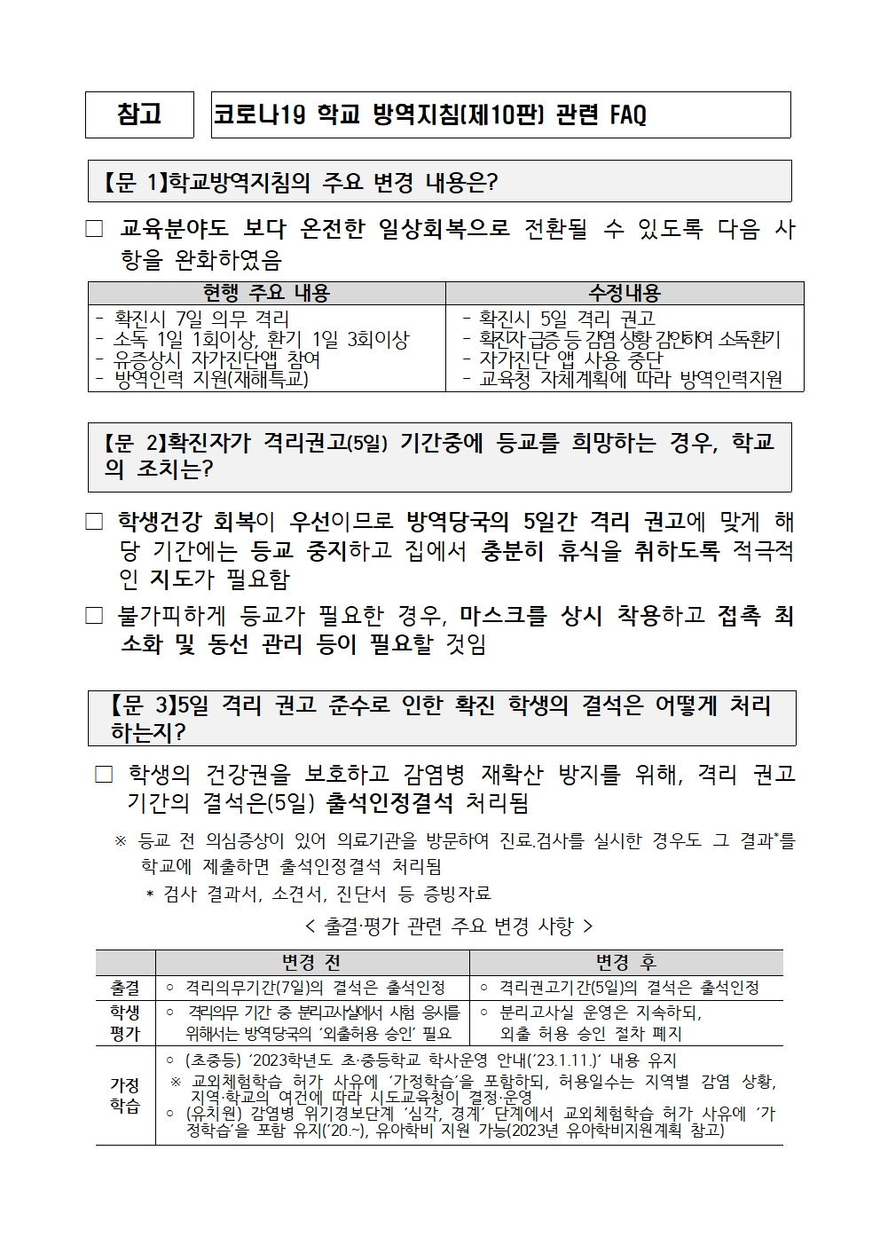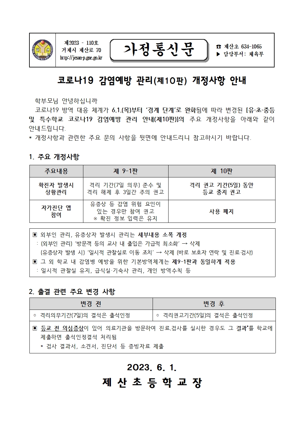 코로나19 방역 대응 체계가 6.1.(목)부터 ‘경계 단계’로 완화됨에 따라 변경된 [유·초·중등 및 특수학교 코로나19 감염예방 관리 안내(제10판)]의 주요 개정사항을 아래와 같이 안내드립니다.