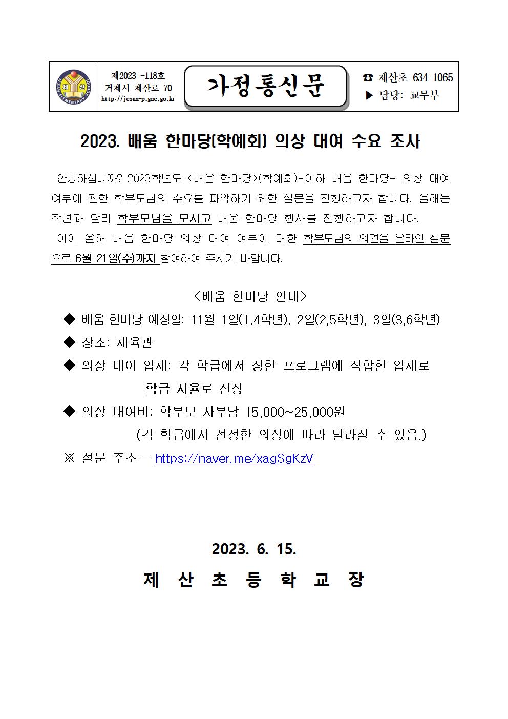 2023. 배움한마당(학예회) 의상 대여 설문 안내