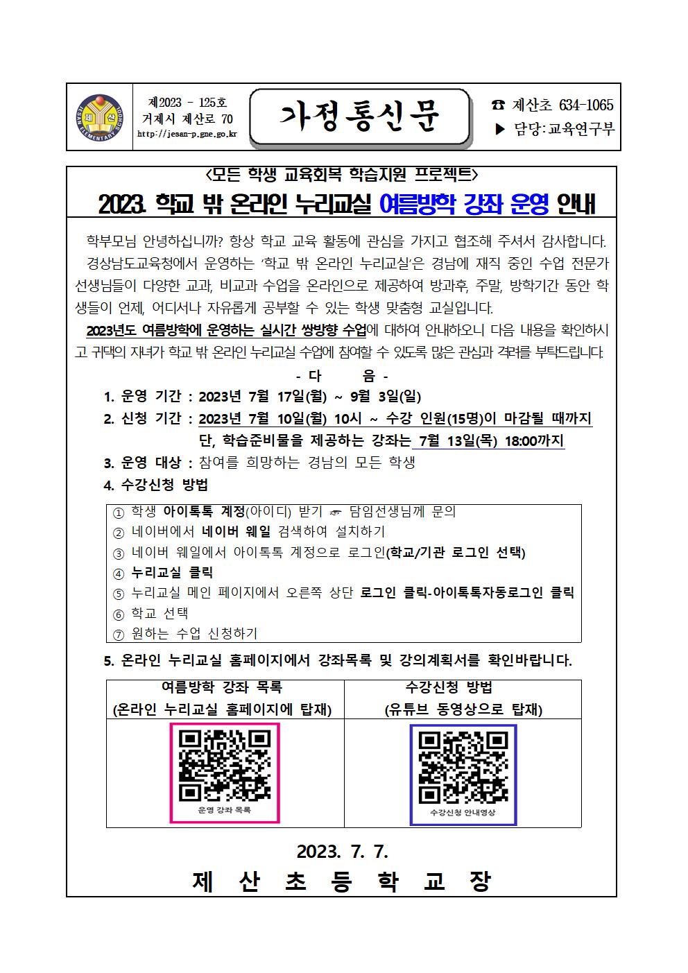 2023. 학교 밖 온라인 누리교실 여름방학 강좌 운영 안내