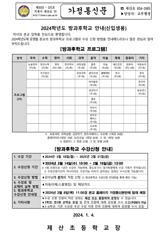 2024학년도 방과후학교 운영 및 신청 안내
