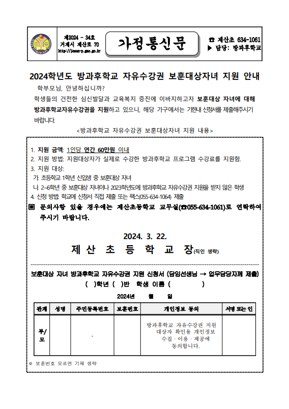 2024학년도 방과후학교 자유수강권 보훈대상자녀 지원 안내 가정통신문