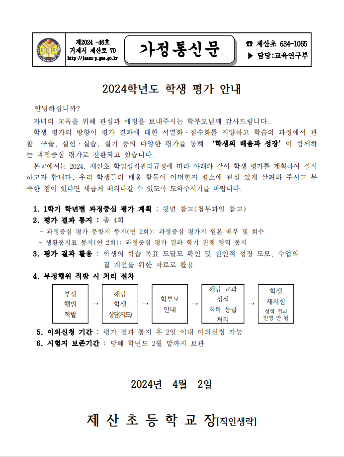 2024학년도 제산초 학생평가 및 1학기 학년별 과정중심 평가 계획 안내드립니다.