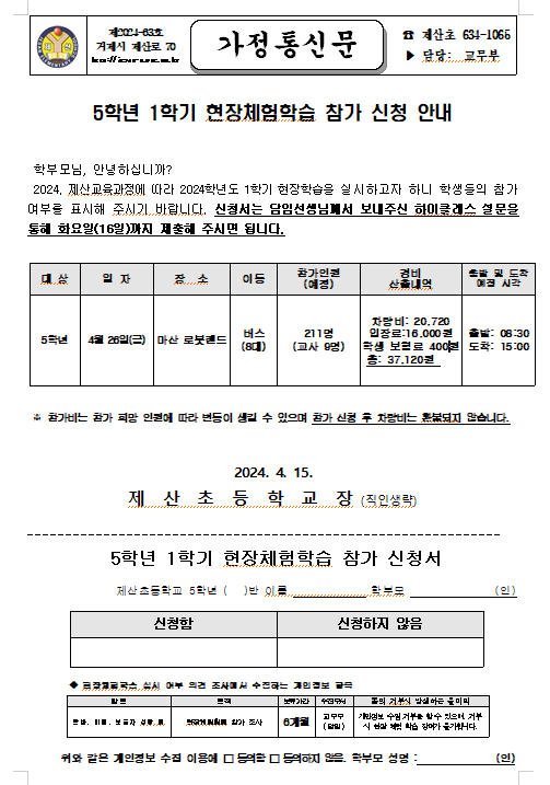 5학년 1학기 현장체험학습 참가 신청 안내 가정통신문
