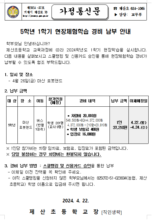 2024. 5학년 1학기 현장체험학습 경비 납부