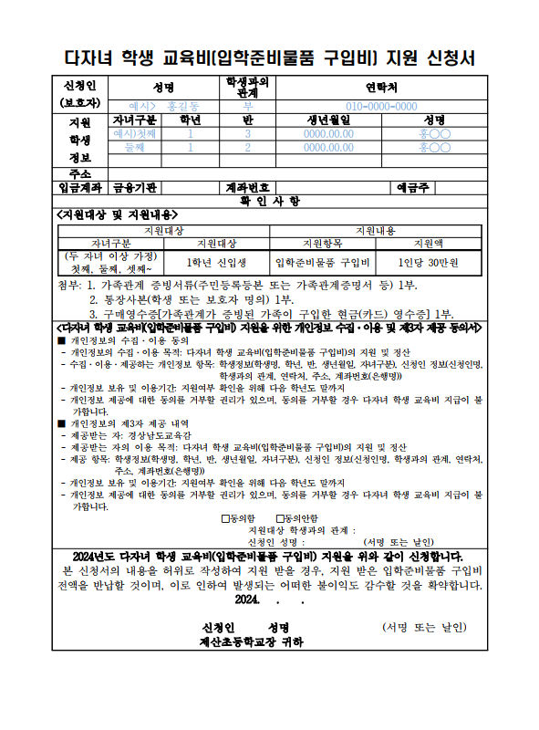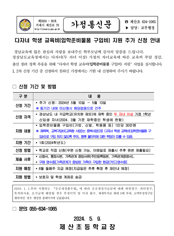 2024학년도 다자녀 학생 교육비(입학준비물품 구입비) 추가 지원 신청 안내 가정통신문