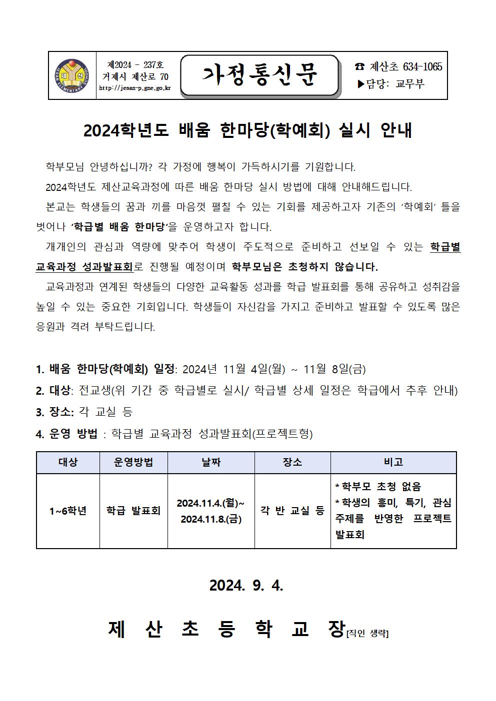 2024학년도 배움 한마당(학예회) 실시 안내.pdf