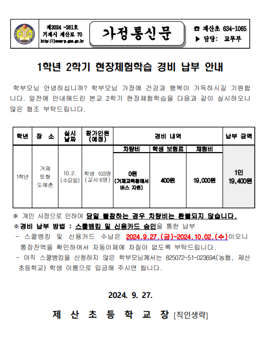 1학년 2학기 현장체험학습 경비 납부 안내