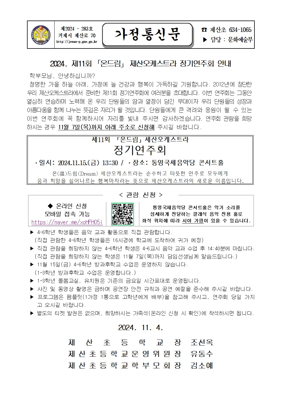 2024. 제11회 온드림 제산오케스트라 정기연주회 안내 가정통신문