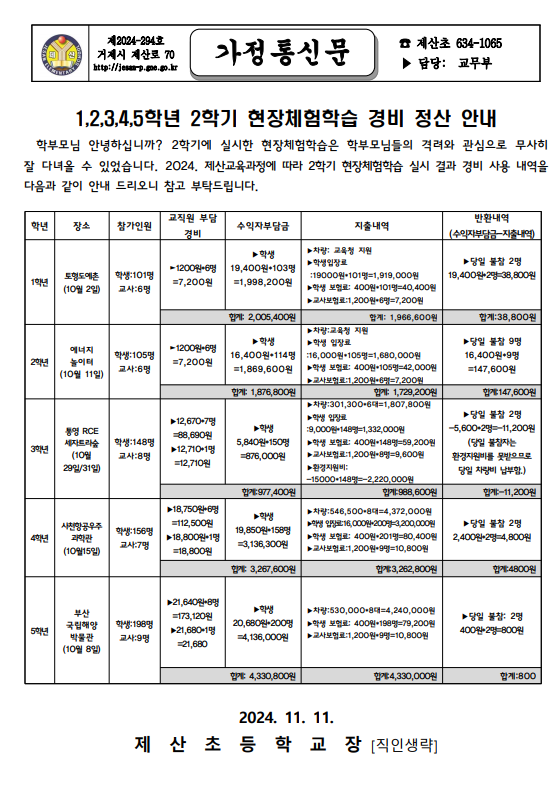 1,2,3,4,5학년 2학기 현장체험학습 경비 정산 안내