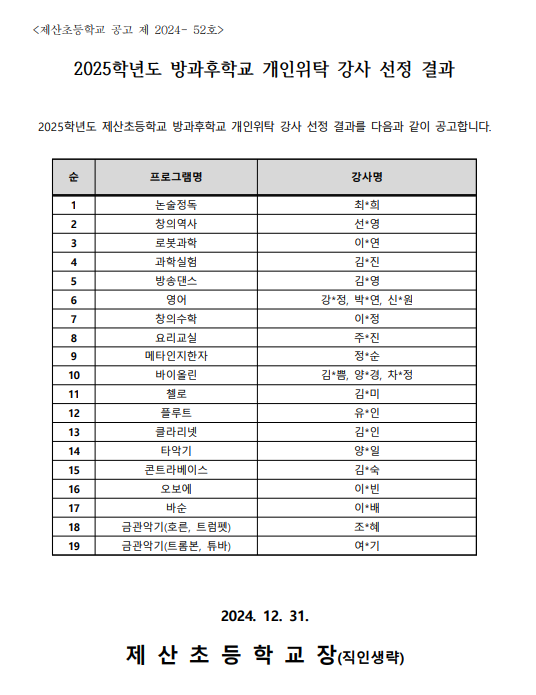2025학년도 방과후학교 개인위탁 외부강사 선정 결과 공고