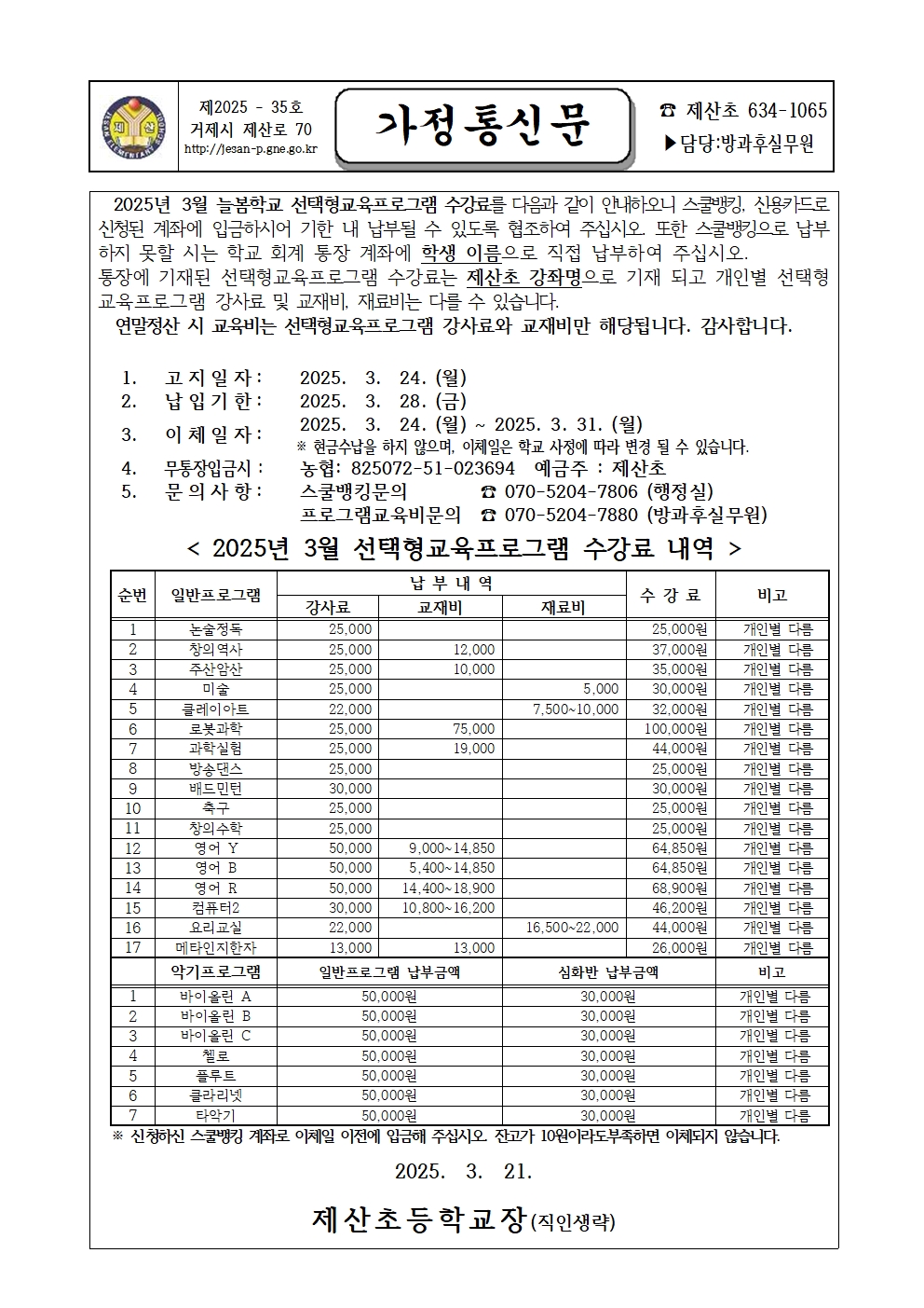 2025학년도 3월 늘봄학교 선택형교육프로그램(방과후학교)수강료 가정통신문