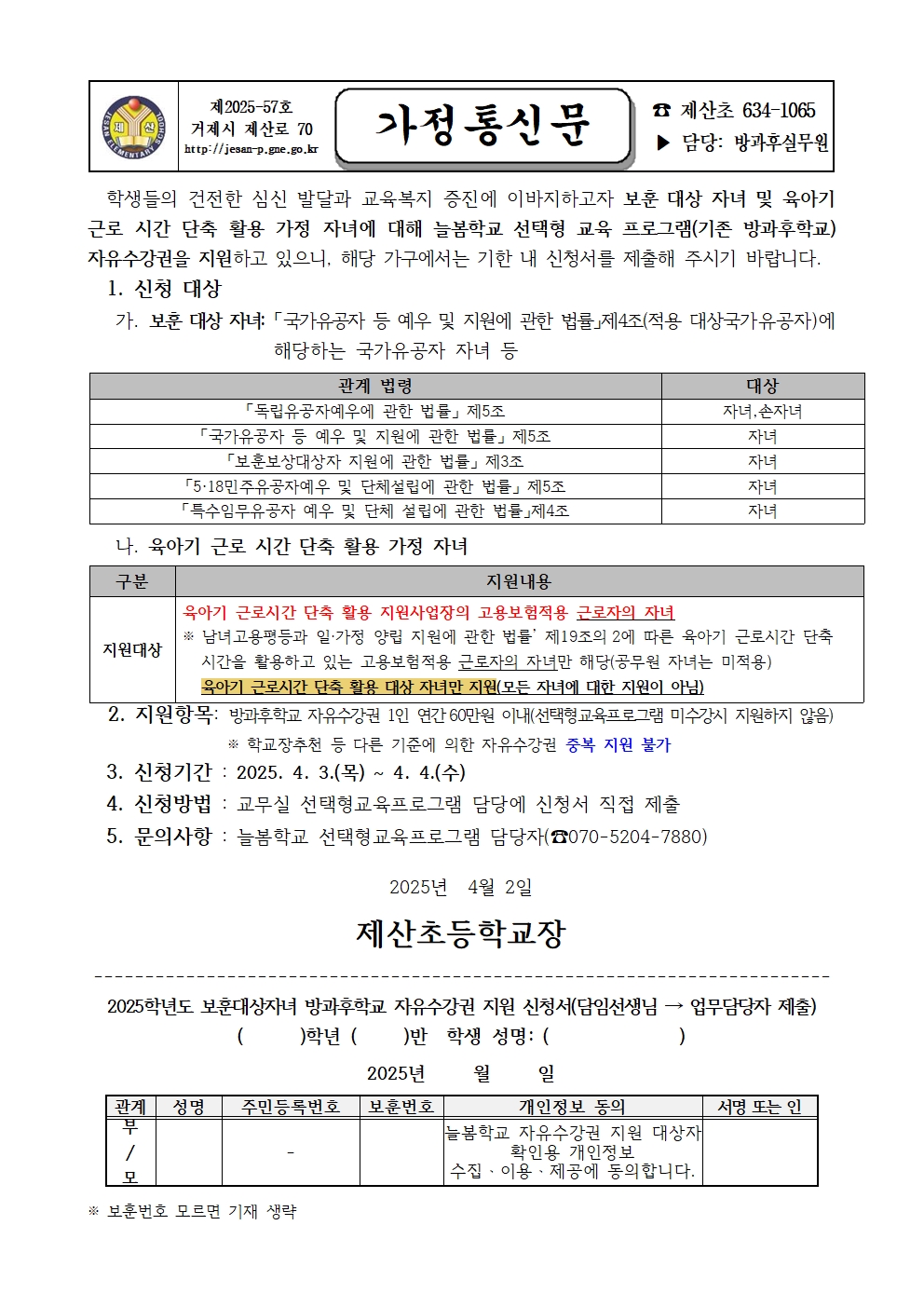 보훈 대상 자녀 및 육아기 근로 시간 단축 활용 가정 자녀 자유수강권 신청 안내