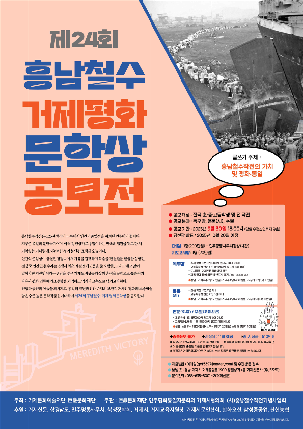가. 공모명: 제24회 흥남철수·거제평화문학상 공모전 나. 주제: 흥남철수작전의 가치와 평화·통일 다. 응모 자격: 전국 초·중·고등학생 및 전 국민 라. 응모 기간: 2025. 9. 30.(화) 18시(당일 우편소인까지 유효) 마. 당선작 발표: 2025. 10. 21.(화) 예정 바. 시상식: 2025. 11. 예정 사. 응모 부문 및 분량 아. 제출방법: 이메일(gcf3397@naver.com) 및 우편·방문 접수 자. 제출처: (53251) 경남 거제시 거제중앙로 1900 청원상가 4층 거제신문사 차. 문의: (055)635-8001∼8002 카. 기타 - 독후감 권장도서 목록은 파일 참조 - 독후감은 제목 다음에 부제로 읽은 책 기재 ※ (예시) 제목 다음 한 줄을 내려 ‘○○○을 읽고 ~ ’ - 독후감·산문·수필·운문 중복 응모 불가 - 독후감·산문·수필은 원고지 매수에 페이지 표시 타. 작성기준 : A4용지, 한글파일 11포인트, 줄 간격 160 파. 출품작품은 반환하지 않으며, 수상작은 수상집을 발간해 시상식 당일 수상자에게 무료 배부, 수상작은 거제신문사 신문 지면에 게제 등