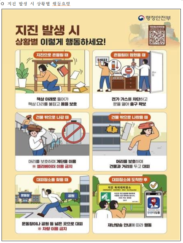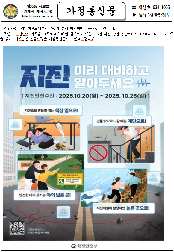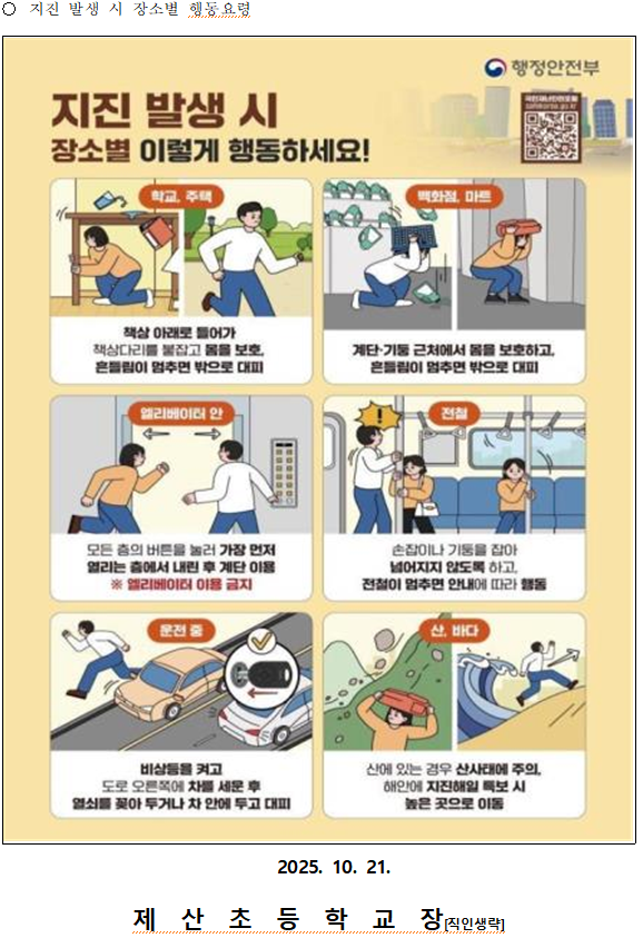 2025년 지진안전주간(10.20~10.26)을 맞아 지진안전 행동요령 교육 안내장을 배부 합니다.
