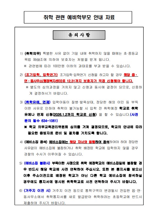 2026학년도 취학대상자(예비 1학년) 예비소집 안내