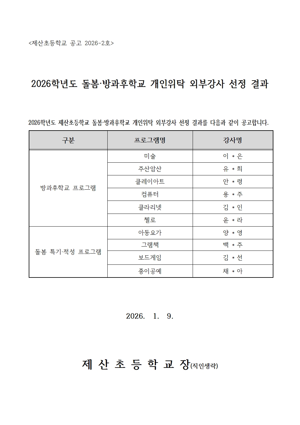 2026학년도 돌봄·방과후학교 개인위탁 외부강사 선정 결과